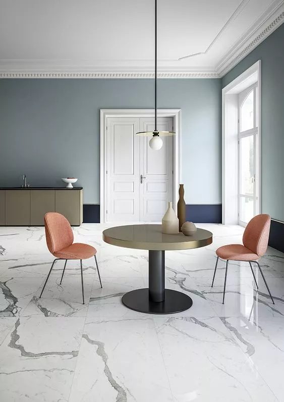 歐洲的室內(nèi)設(shè)計(jì)更多地在探尋家具如何為已經(jīng)精心設(shè)計(jì)的室內(nèi)空間錦上添花。當(dāng)室內(nèi)空間已經(jīng)足夠現(xiàn)代的時(shí)候,設(shè)計(jì)師們會(huì)尋找更加獨(dú)特的設(shè)計(jì)語言來表達(dá),賦予空間獨(dú)一無二的標(biāo)記。一個(gè)簡(jiǎn)單又有力的方式就是在房間里的墻上下部分涂上不同顏色的涂料。