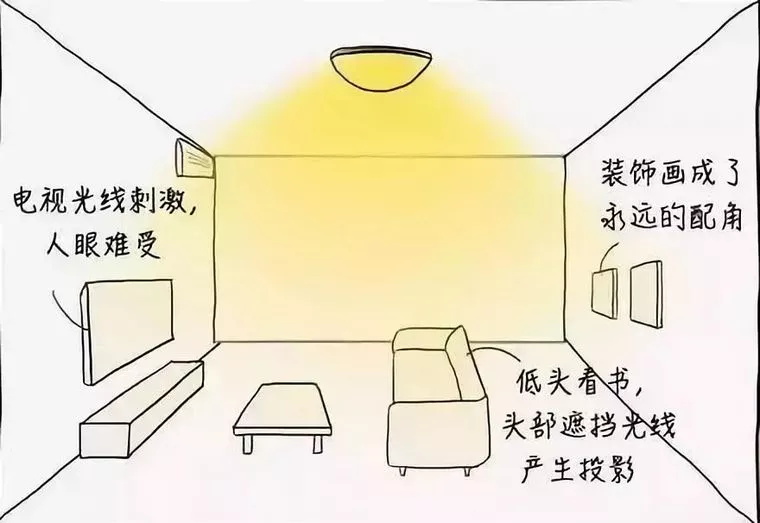 一般人都會想,房間只要夠亮就行了,于是就出現了下面這種“一盞熒光燈or吸頂燈走天下”的死板場景 ↓