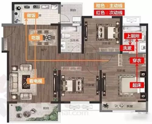 戶型動線是指人在戶內活動的路線,好的動線能夠提升戶型利用率,進而提高人們的居住品質。戶內動線主要有三種,分別是居住動線、家務動線、來客動線。良好的動線是指從入戶門進客廳、臥室、廚房的三條線不會交叉。