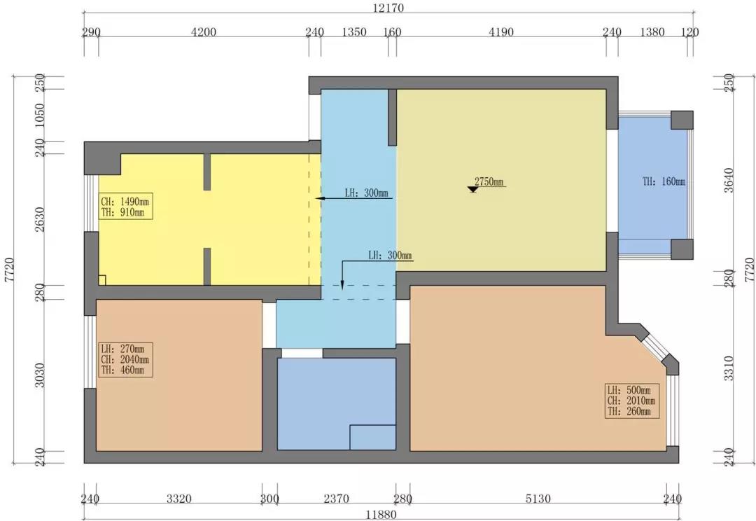 格局主要改動在主臥、兒臥、書房及設備區域:新建墻體,分割空間,最終形成了四臥、一書房的布局。