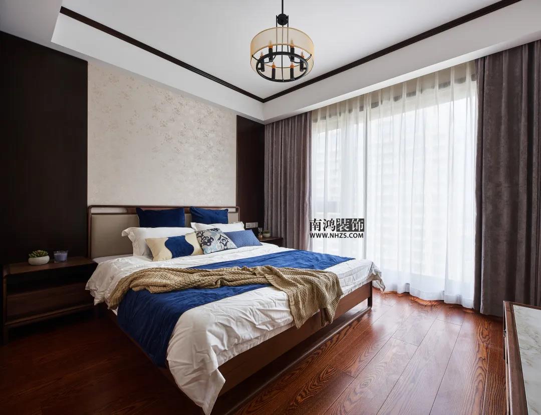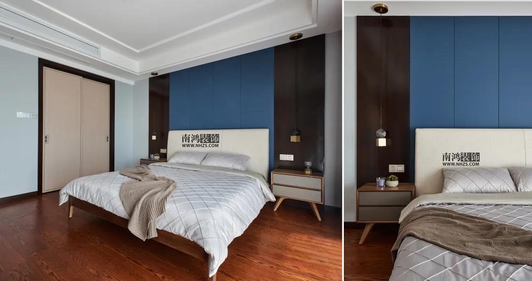 主臥背景選用亞麻色的印花墻紙,亞麻色比白色溫暖,比黃色低調,搭配任何顏色都不會突兀。床品點綴深藍,鮮活視覺。