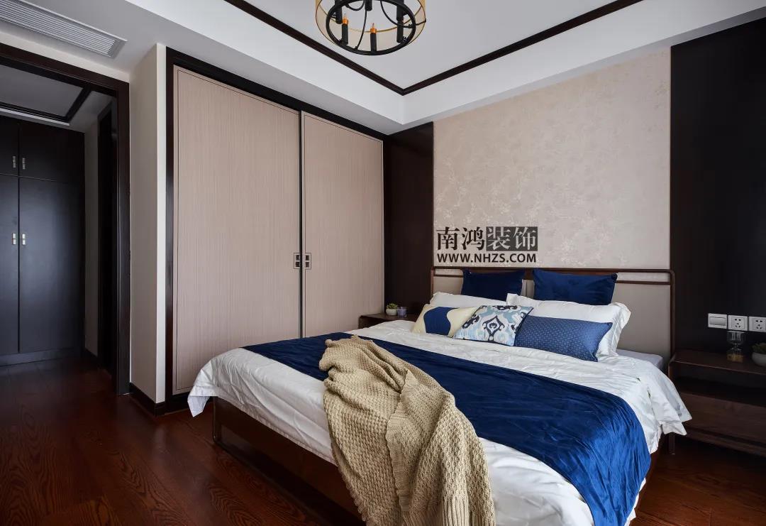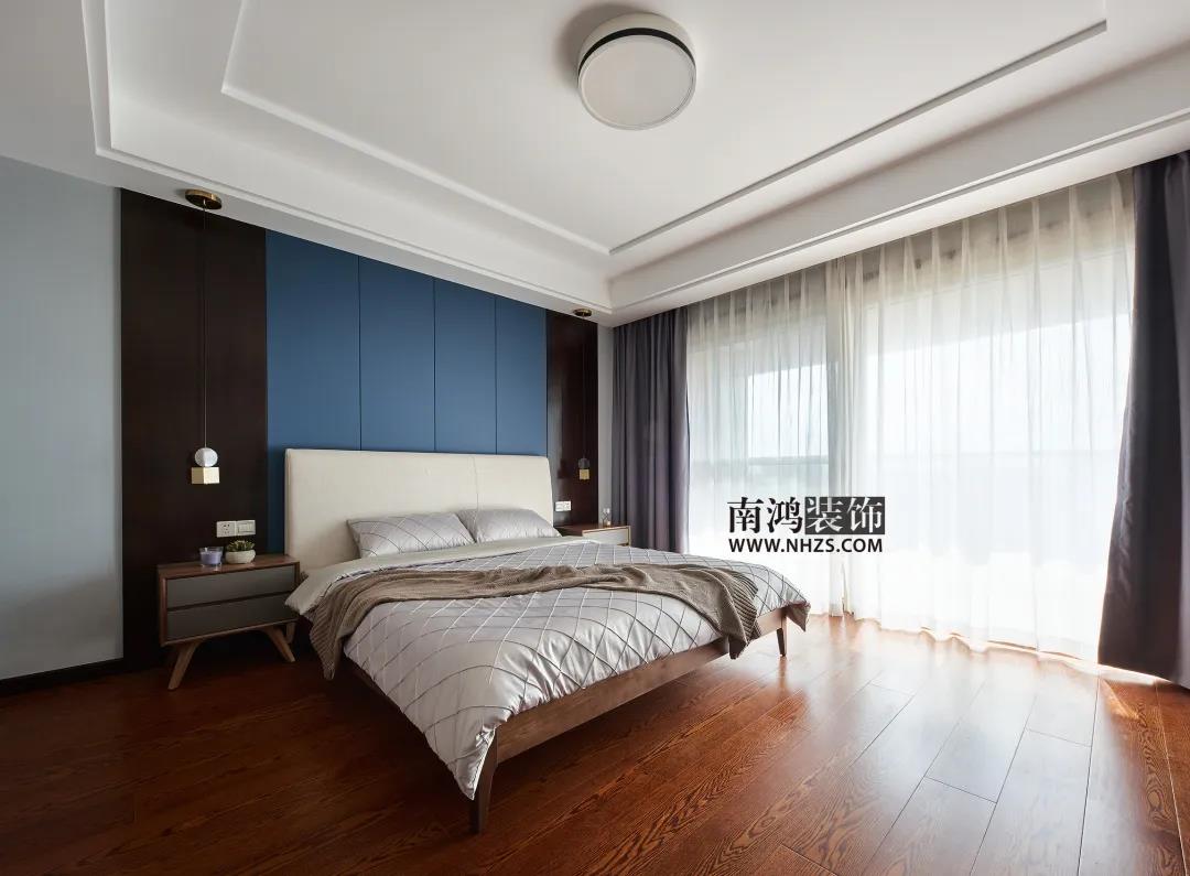 業主大兒子的房間,應居住者需求,淡化了中式元素而更偏向現代風格。雙層折邊吊頂簡潔大氣,床頭背景墻選用藍色硬包結合木飾面,床頭柜上方設計了金屬色吊燈點綴空間。