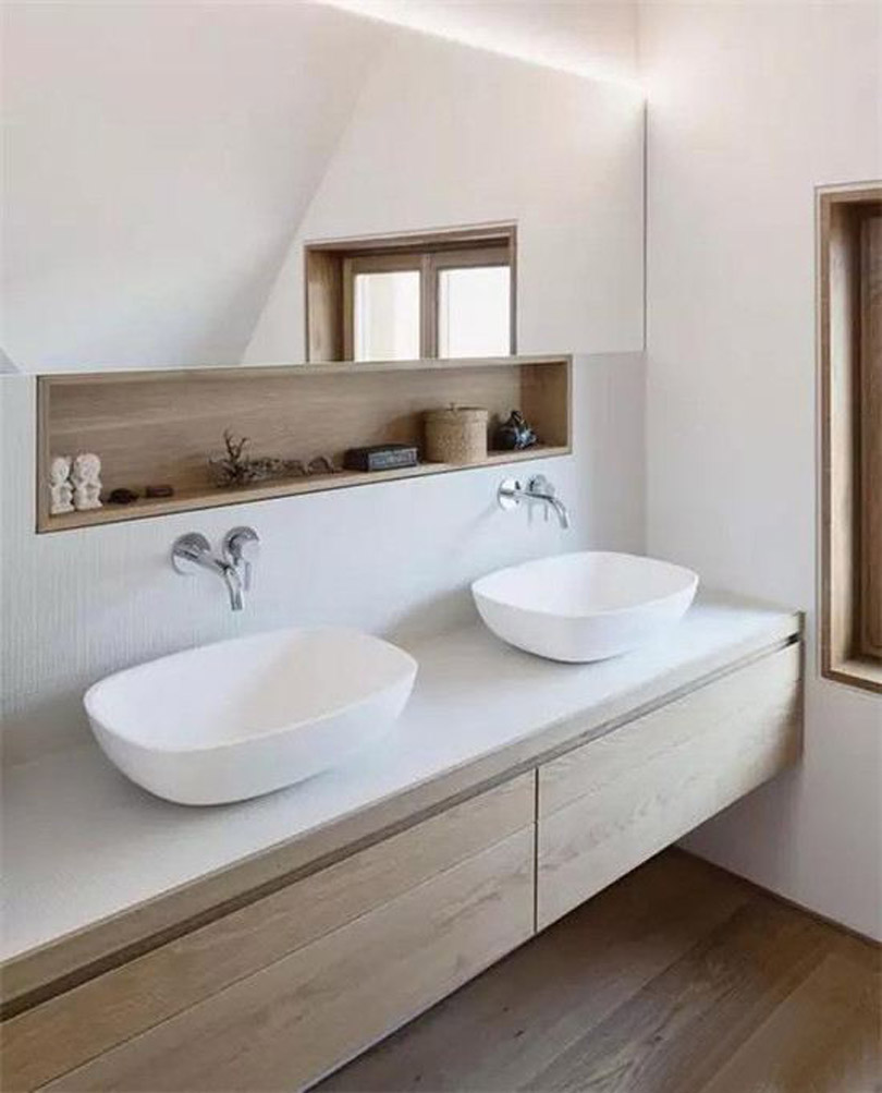 對于衛生間來說,肯定會需要做下水管道,同時也會有新建墻體的出現,此時就可以利用下水管道和新建墻體的位置,巧妙的做出壁龕的設計,這樣既能解決收納空間不足的問題,同時又能讓衛生間變得更加漂亮,空間更加靈動。