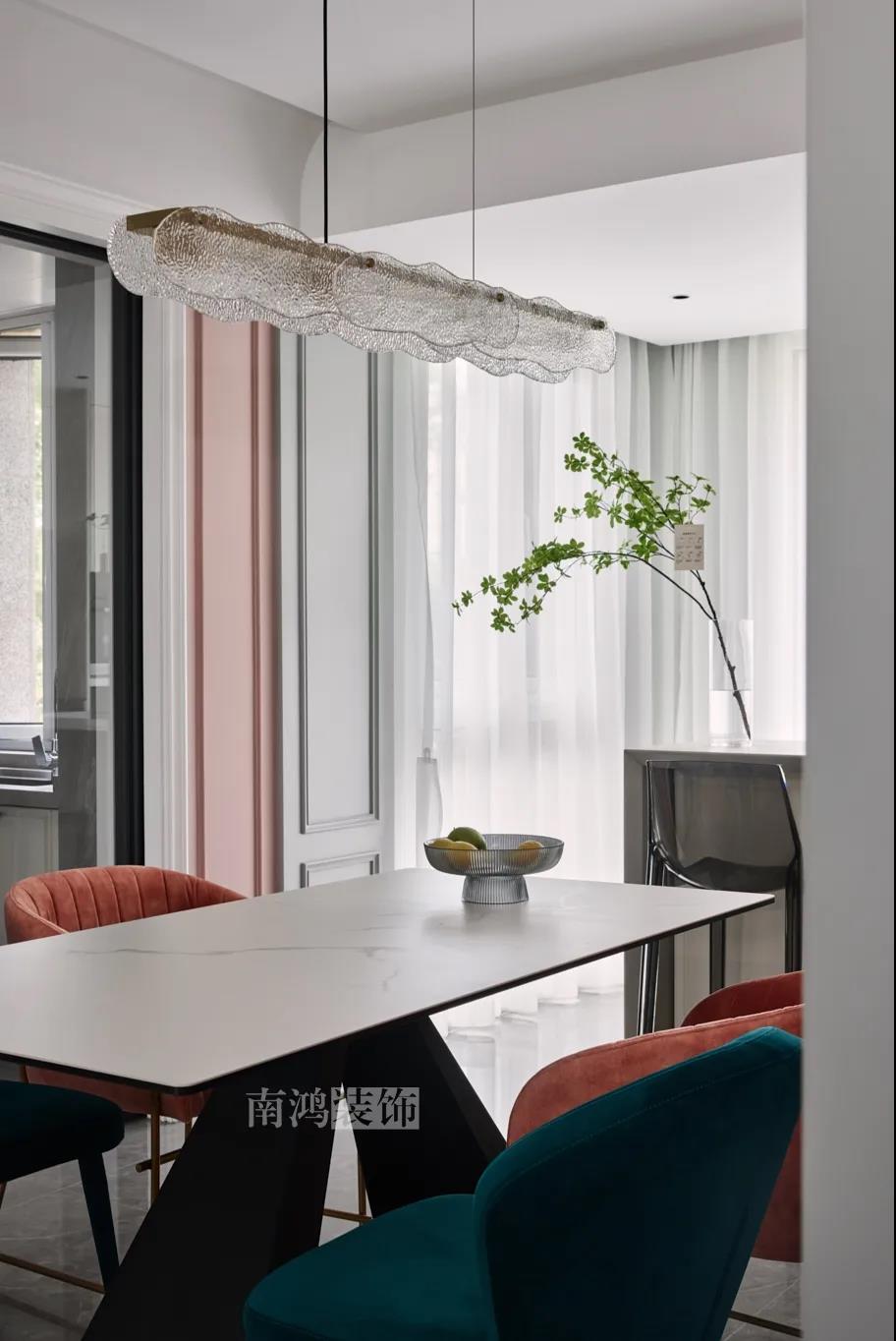 01. 客戶需求 本案的屋主非常喜歡小美式風(fēng)格的清新自在,又向往著現(xiàn)代簡約所傳達(dá)的生活理念,所以設(shè)計(jì)師依照他的喜好,將兩種風(fēng)格元素巧妙糅合,讓整體空間在浪漫優(yōu)雅的情調(diào)中傳遞出主人的獨(dú)特品味。 02. 裝飾亮點(diǎn) REFRESHING 擯棄了粗暴的材質(zhì)堆砌,將小美式與現(xiàn)代簡約巧妙結(jié)合在一起,色調(diào)上選用低飽和度的高級灰與柔和的莫蘭迪色,致力于呈現(xiàn)一個唯美純粹、具備高級感的美學(xué)空間。 03. 戶型圖 04. 設(shè)計(jì)落地 客 廳 客廳以高級灰為主基調(diào),低飽和度的特性使得它具備很強(qiáng)的包容性。 電視背景將美式的經(jīng)典線條護(hù)墻與利落的大理石磚組合,沙發(fā)背景則做了木護(hù)墻隱形門處理,配以簡單干凈又不減細(xì)節(jié)的吊頂,既實(shí)現(xiàn)了兩種不同風(fēng)格元素的結(jié)合,又能讓造型為居家功能服務(wù)。 靠近陽臺擺放一把亮麗單椅,電子壁爐內(nèi)躍動著溫暖的火苗,成為美妙的休憩一角。 節(jié)制而有意蘊(yùn)的設(shè)計(jì)手法,賦予空間最具詩意的內(nèi)涵表達(dá)。 開放的領(lǐng)域中,客餐之間連貫而又相對獨(dú)立,在敞闊的尺度中讓主人感受到家的舒適。 餐 廳 餐廳,是讓人走近便頓覺眼前一亮的空間所在。花朵般嬌嫩的煙粉色,是莫蘭迪色系中超有存在感的一派,又如晚霞,純凈美好,撲面而來便是夢幻與浪漫的氣息。 餐廳處還添加入西廚的功能,讓廚房實(shí)現(xiàn)多功能化,同時弱化了原區(qū)域的狹長感。 過 道 “人生忽如寄,莫辜負(fù)茶、湯和好天氣。”清朗平和的過道景致,自給人一種寧靜的深邃感受。 臥 室 臥室刪繁就簡,通過淺色的床品與干凈的硬包背景,營造簡約純粹的清韻。 兒童房是一個多姿多彩的空間,活潑的星星圖案,多種低飽和色調(diào)搭建的背景墻面,整體氣氛輕松愉悅,作為一個成長型空間來說也充滿著可塑性。 衣 帽 間 純白的視象,抽離了所有多余的表達(dá),兩側(cè)衣柜默默擔(dān)當(dāng)著收納的使命,井然有序地包容著一切冗雜。