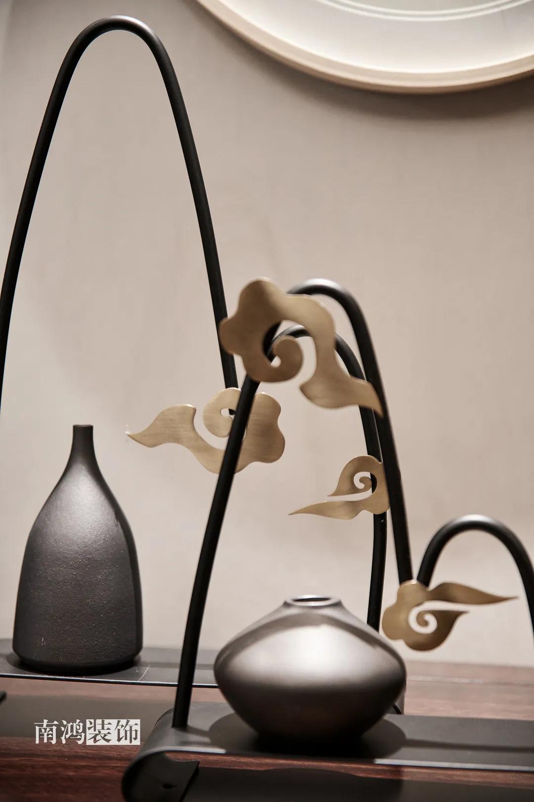 瓷盤花藝、畫扇茶器等中式元素,共同構筑起這個清雋和雅的室內場景,使其更為飽滿的同時視覺上也更有層次。