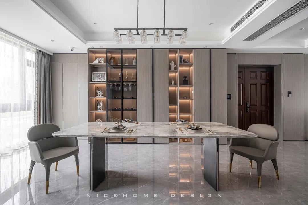 大理石紋的餐桌組合不銹鋼桌腳,圓角設計勾勒著藝術感知。背景做整墻柜體,除了收納餐具、酒品之外,也方便展示一些個性單品。