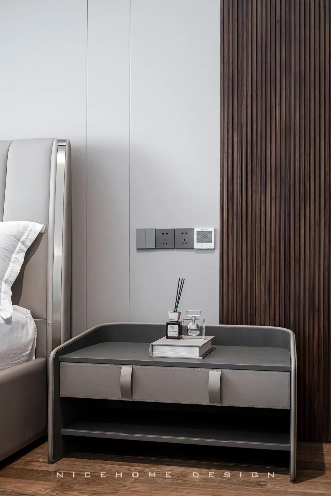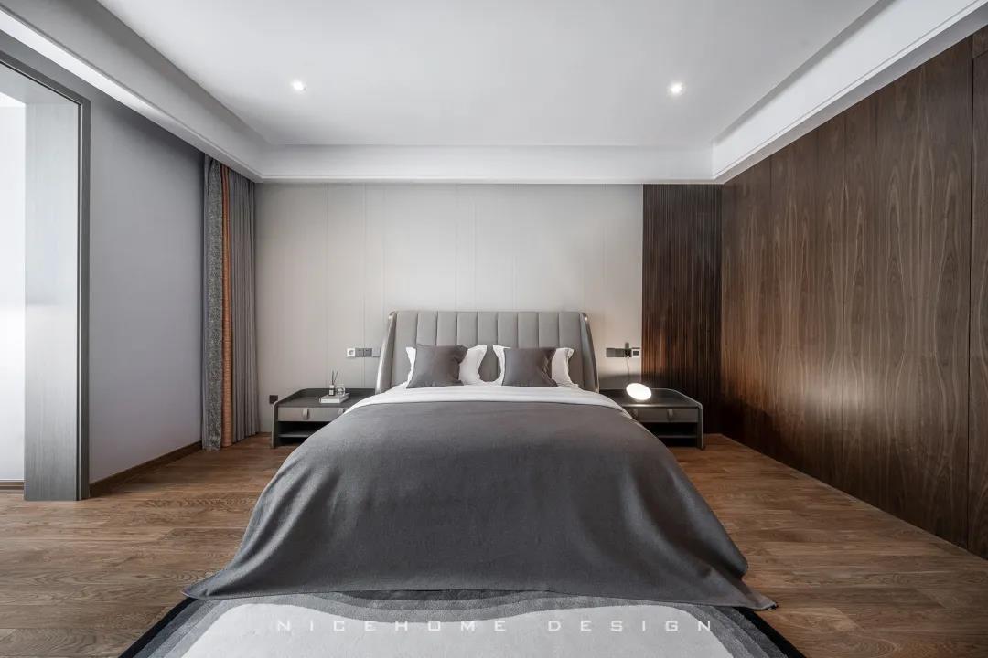 睡眠區(qū)域簡潔沉穩(wěn),高級灰色調與深木色有助于營造安靜而放松的休憩氛圍。