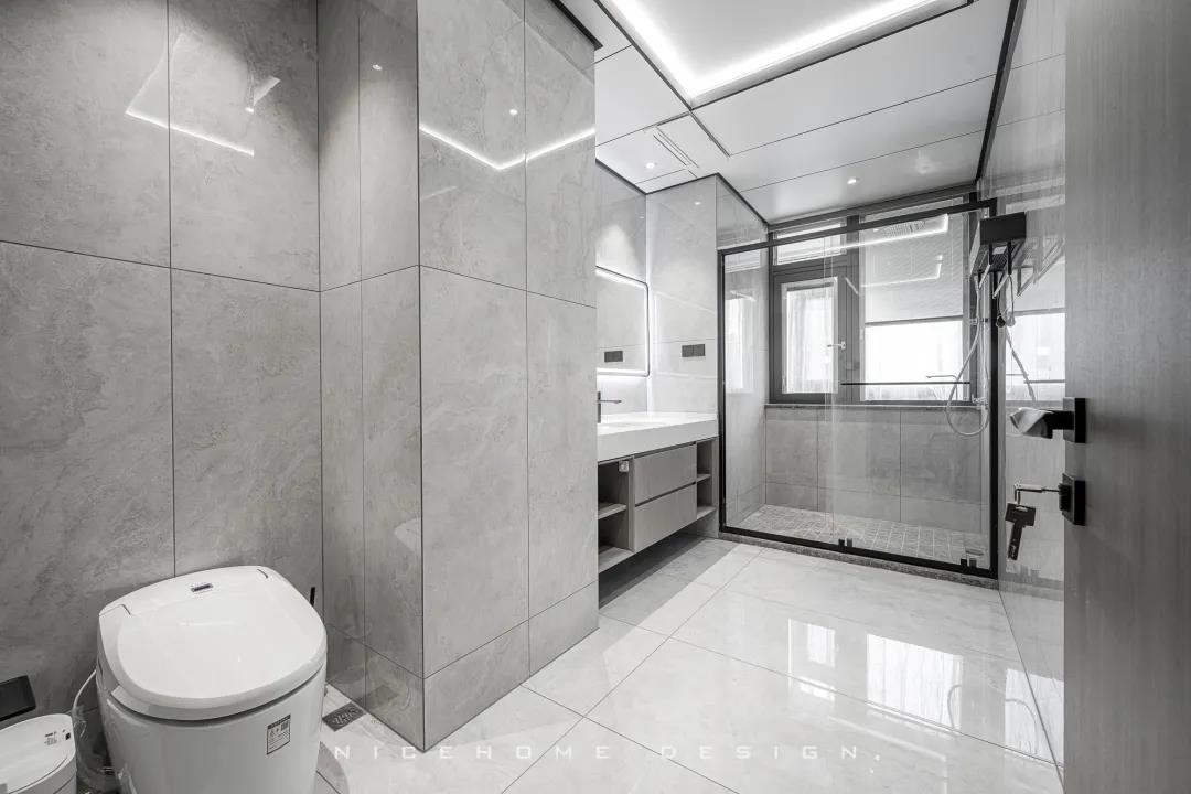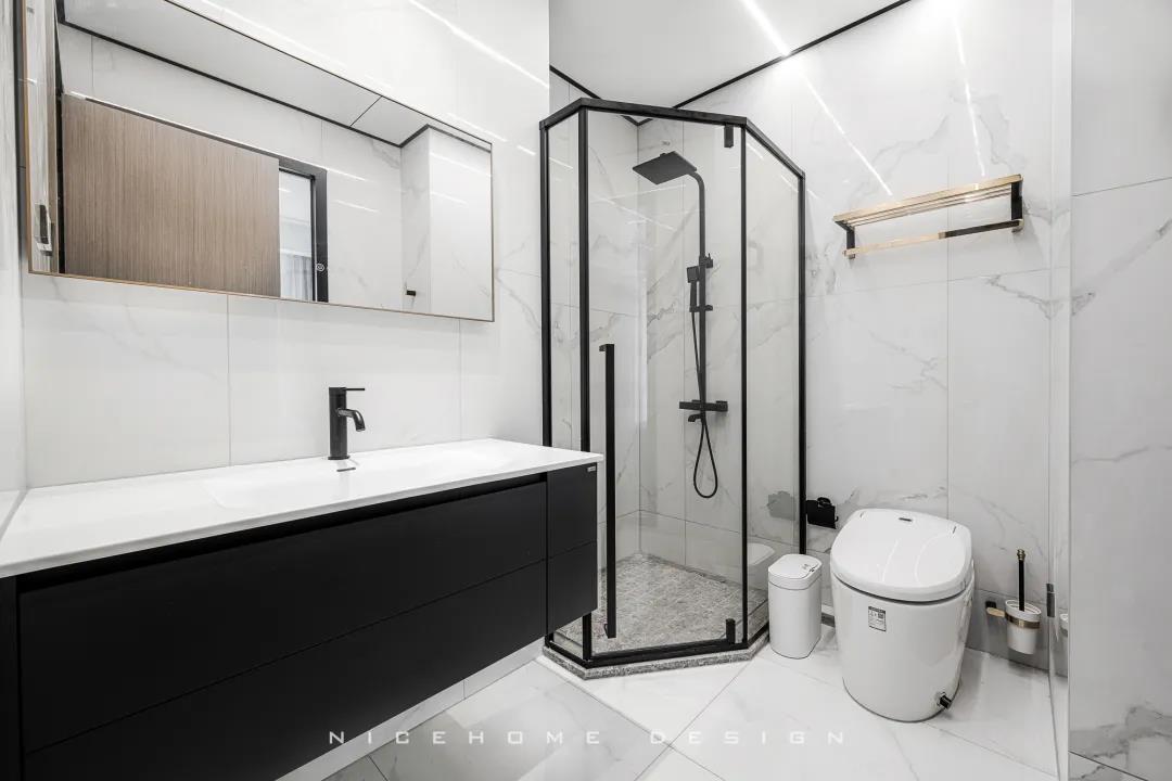 公衛(wèi)與次衛(wèi),空間分別用灰色與白色的瓷磚統(tǒng)一鋪就,干凈整潔,白凈的基底疊加上黑色線條,看上去會更有品質且視覺不再單一。